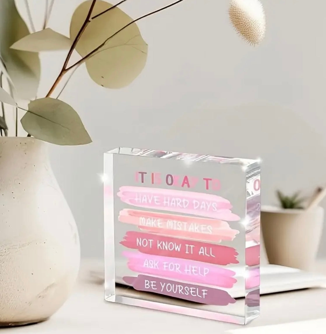 Brighten up your space with this beautifully designed acrylic block featuring motivational reminders in soothing shades of pink. Crafted from high-quality, crystal-clear acrylic, this piece is both sturdy & stylish, perfect for desks, shelves or bedside tables