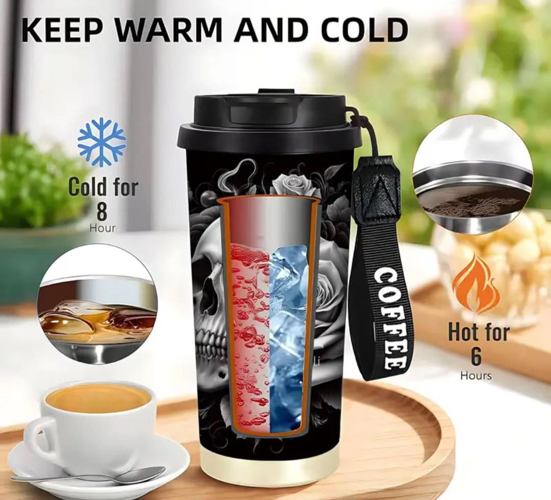 Elevate your coffee game with this striking gothic travel tumbler, featuring a bold skull & white rose design set against a dark, dramatic background. Perfect for lovers of alternative, gothic or edgy style, this tumbler keeps your drinks at the perfect temperature—hot for up to 6 hours or cold for up to 8 hours thanks to its insulated stainless-steel interior