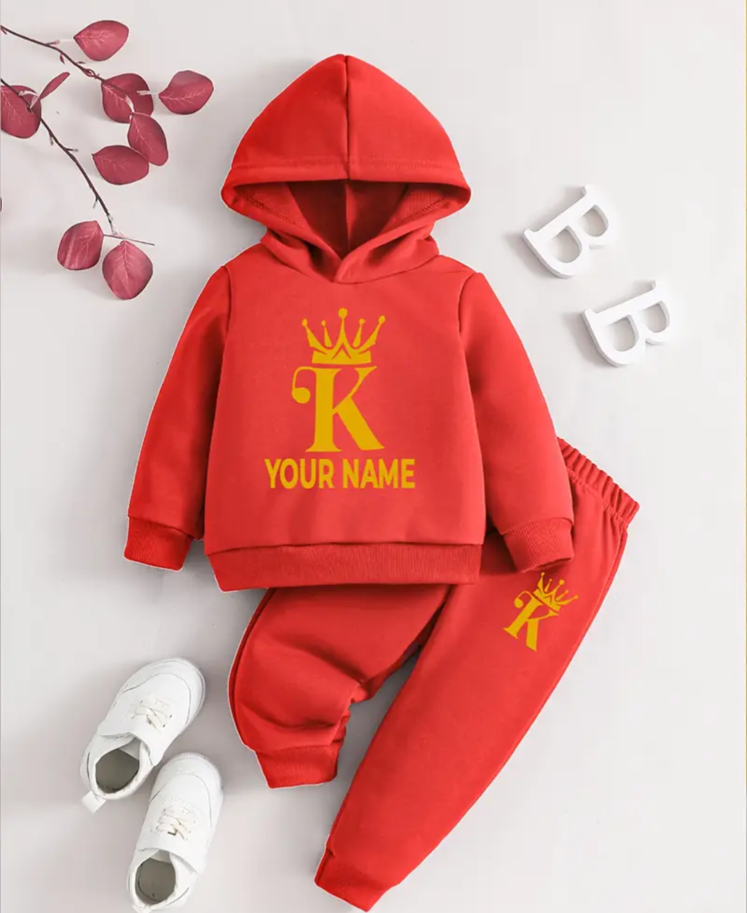 Let your little one shine like royalty with this customisable hoodie & jogger set. Featuring a bold crown & initial design with space to add your child’s name, this set is as unique as they are. Made from soft, breathable cotton blend fabric, it’s designed to keep kids comfy all day—whether at playtime, lounging or outings